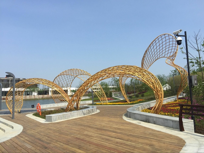 本屆博覽會由江蘇省人民政府主辦,以“水墨江南·園林生活”為主題。連云港展園位于本屆園藝博覽會的“鄉(xiāng)情”片區(qū),占地面積5000平方米,景觀以“水鄉(xiāng)人家”為主題,將“人家”、“漁歌”、“泊舟”等場景感知融入其中,表達了記憶中的水鄉(xiāng)民居及空間意境。連云港展園主要以竹林烘托幽靜的氣氛外,水生植物如香蒲也增添了展園的水鄉(xiāng)自然野趣。